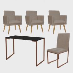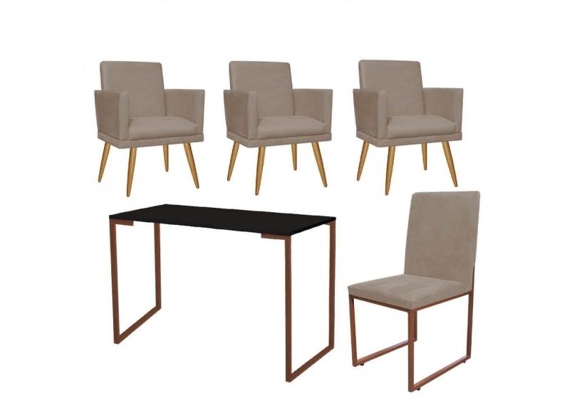 Kit Escritório Stan 3 Poltronas Rodapé com Cadeira e Mesa Industrial Preto Bronze Tecido Sintético Bege - Ahz Móveis