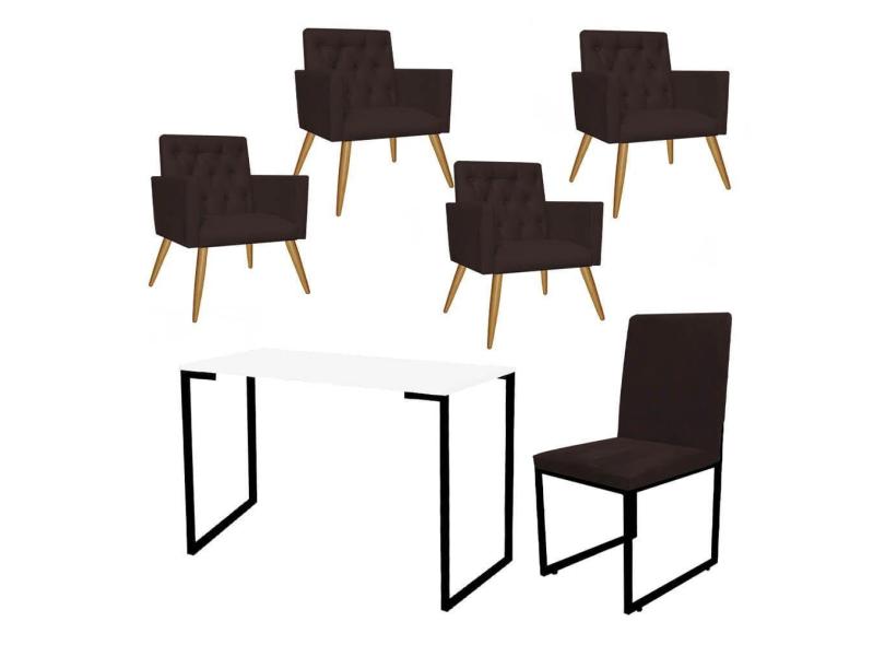 Kit Escritório Stan 4 Poltronas Capitonê com Cadeira e Mesa Industrial Branco Preto Corino Marrom - Ahz Móveis