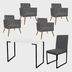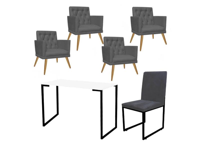 Kit Escritório Stan 4 Poltronas Maria com Cadeira e Mesa Industrial Branco Preto Tecido Sintético Cinza - Ahz Móveis