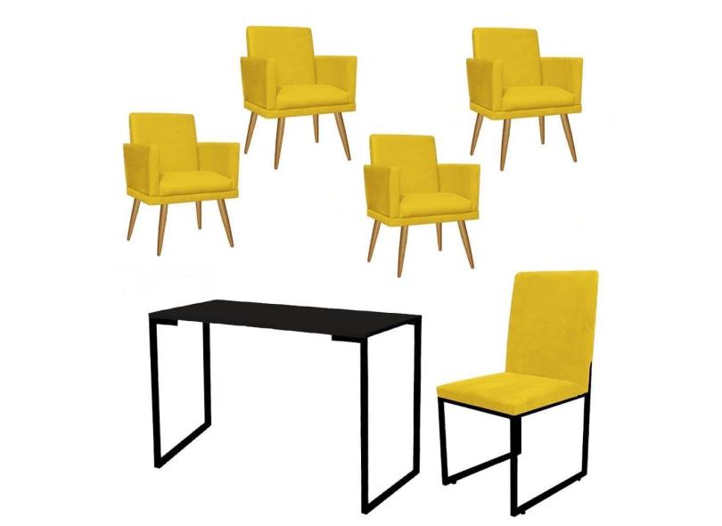 Kit Escritório Stan 4 Poltronas Rodapé com Cadeira e Mesa Industrial Tampo Preto Tecido Sintético Amarelo - Ahz Móveis