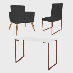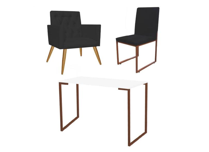 Kit Escritório Stan Poltrona Capitonê com Cadeira e Mesa Industrial Branco Bronze Corino Preto - Ahz Móveis