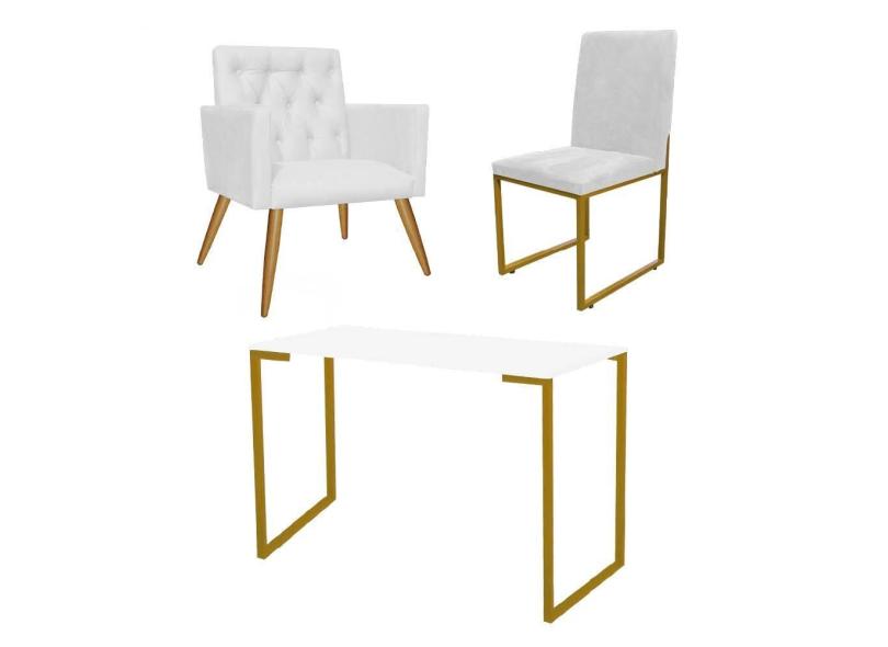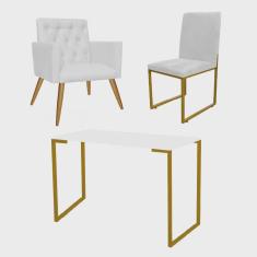 Kit Escritório Stan Poltrona Capitonê com Cadeira e Mesa Industrial Branco Dourado Corino Branco - Ahz Móveis