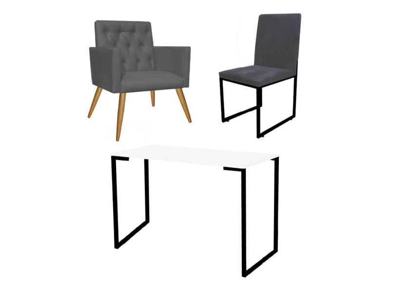 Kit Escritório Stan Poltrona Capitonê com Cadeira e Mesa Industrial Branco Preto Tecido Sintético Cinza - Ahz Móveis