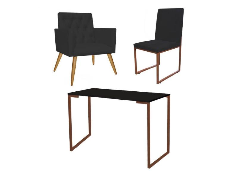 Kit Escritório Stan Poltrona Capitonê com Cadeira e Mesa Industrial Preto Bronze Suede Preto - Ahz Móveis