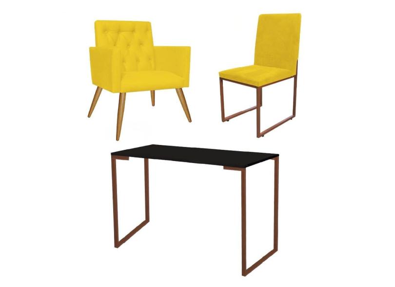 Kit Escritório Stan Poltrona Capitonê com Cadeira e Mesa Industrial Preto Bronze Tecido Sintético Amarelo - Ahz Móveis