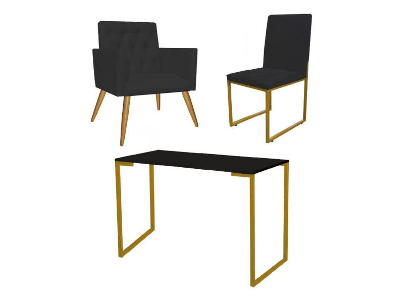 Kit Escritório Stan Poltrona Capitonê com Cadeira e Mesa Industrial Preto Dourado Suede Preto - Ahz Móveis