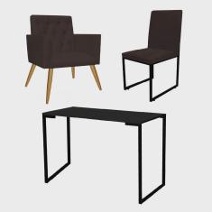 Kit Escritório Stan Poltrona Capitonê com Cadeira e Mesa Industrial Tampo Preto Tecido Sintético Marrom - Ahz Móveis
