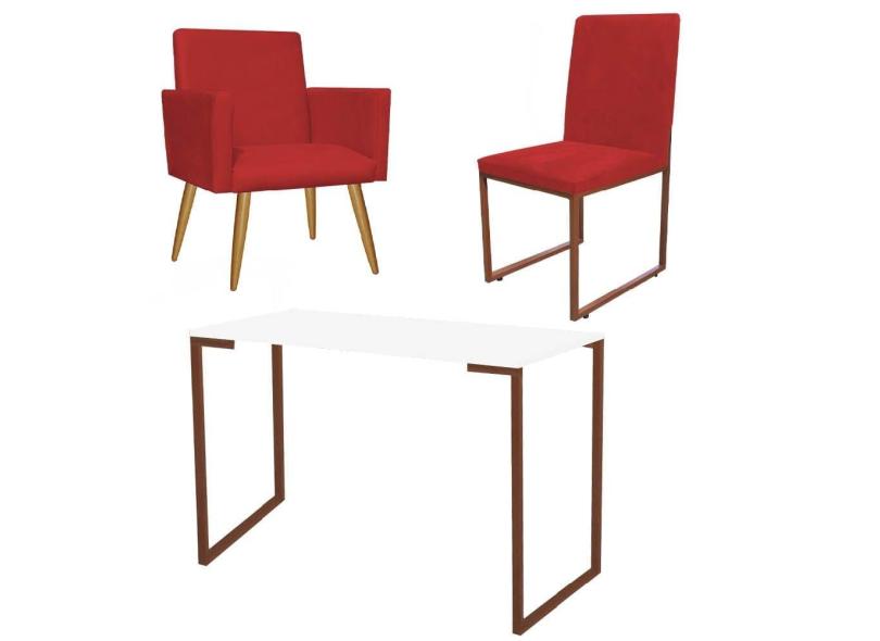 Kit Escritório Stan Poltrona com Cadeira e Mesa Industrial Tampo Branco Bronze Corino Vermelho - Ahz Móveis