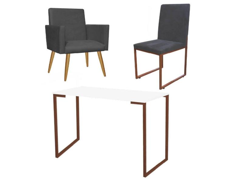 Kit Escritório Stan Poltrona com Cadeira e Mesa Industrial Tampo Branco Bronze Tecido Sintético Cinza - Ahz Móveis