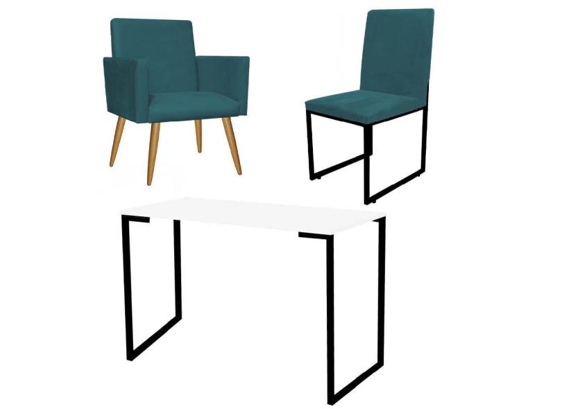 Kit Escritório Stan Poltrona com Cadeira e Mesa Industrial Tampo Branco Preto Suede Azul Turquesa - Ahz Móveis