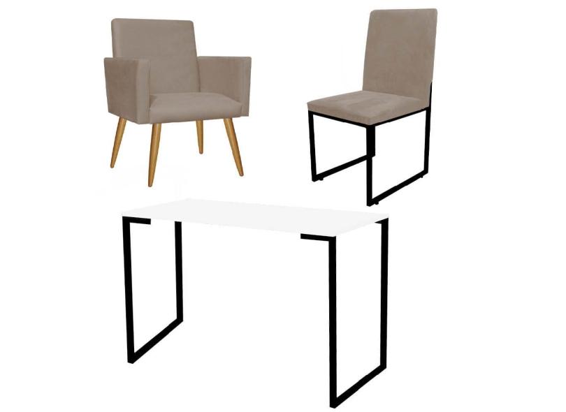 Kit Escritório Stan Poltrona com Cadeira e Mesa Industrial Tampo Branco Preto Tecido Sintético Bege - Ahz Móveis