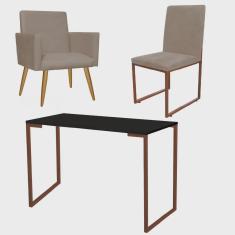 Kit Escritório Stan Poltrona com Cadeira e Mesa Industrial Tampo Preto Bronze Corino Bege - Ahz Móveis