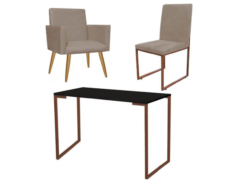 Kit Escritório Stan Poltrona com Cadeira e Mesa Industrial Tampo Preto Bronze Suede Bege - Ahz Móveis
