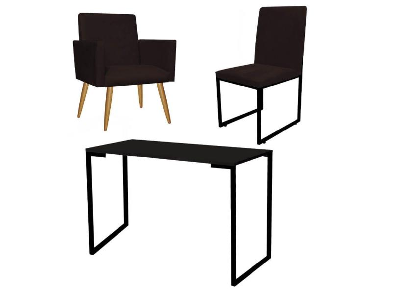 Kit Escritório Stan Poltrona com Cadeira e Mesa Industrial Tampo Preto Corino Marrom - Ahz Móveis