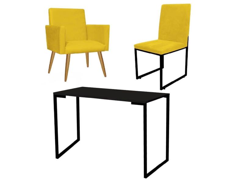 Kit Escritório Stan Poltrona com Cadeira e Mesa Industrial Tampo Preto Tecido Sintético Amarelo - Ahz Móveis