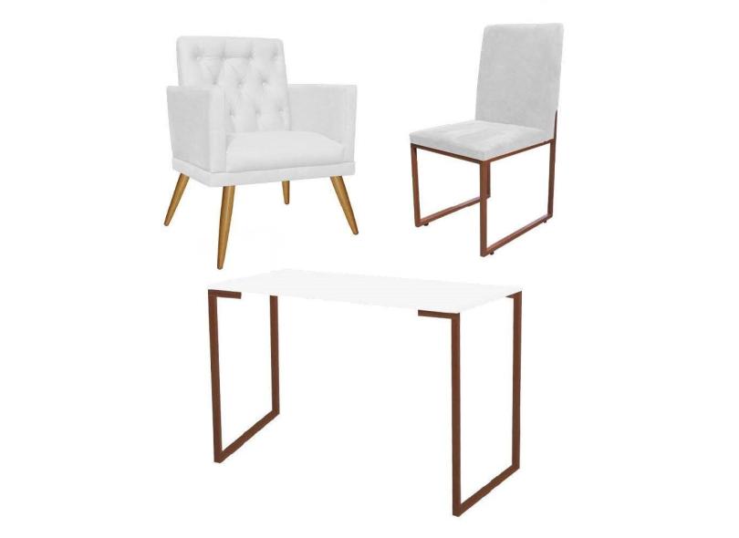 Kit Escritório Stan Poltrona Maria com Cadeira e Mesa Industrial Branco Bronze Tecido Sintético Branco - Ahz Móveis