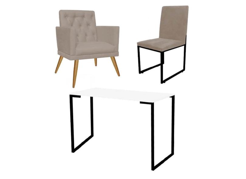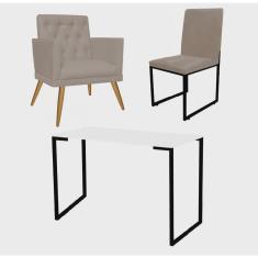 Kit Escritório Stan Poltrona Maria com Cadeira e Mesa Industrial Branco Preto Tecido Sintético Bege - Ahz Móveis