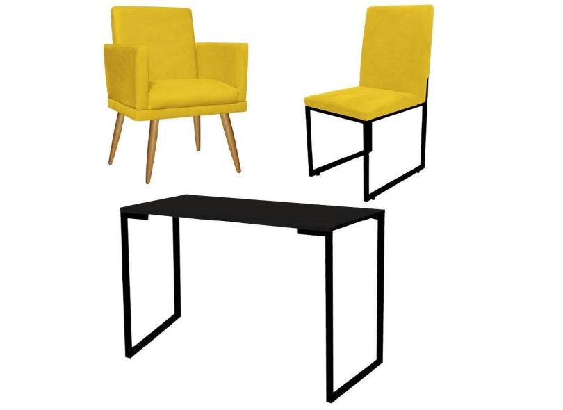 Kit Escritório Stan Poltrona Rodapé com Cadeira e Mesa Industrial Tampo Preto Tecido Sintético Amarelo - Ahz Móveis