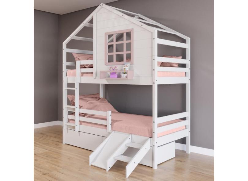 O menor preço encontrado no Brasil para Beliche Casinha com Janela com 02 Gavetas com Escada/ Escorregador e Grade de Proteção Madeira Maciça Branco/ Rosa Housin atualmente é R$ 3.399,21.