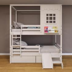 O menor preço encontrado no Brasil para Beliche Casinha Reta com 02 Gavetas Escorregador e Grade Removível Madeira Maciça Branco Housin atualmente é R$ 3.024,42.