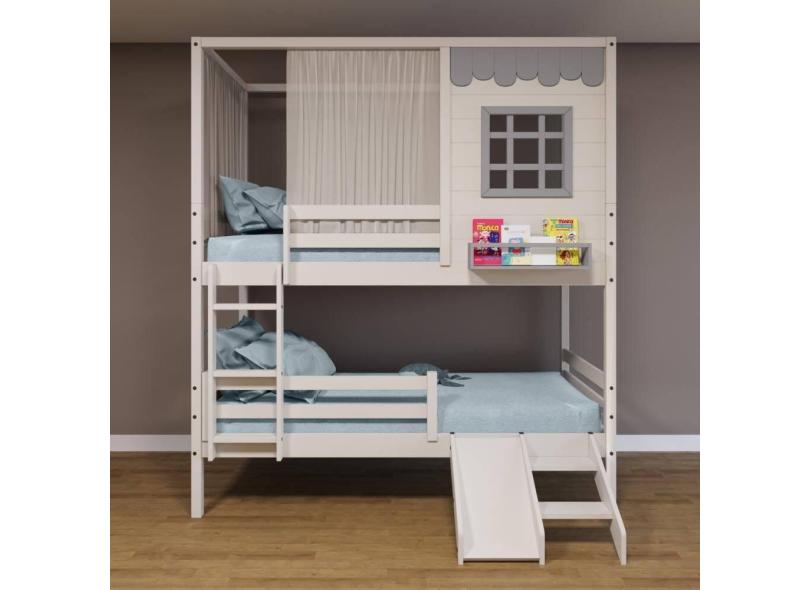 Beliche Casinha Reta com Grade Removível Escorregador e Cortina Madeira Maciça Branco/ Cinza Housin