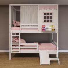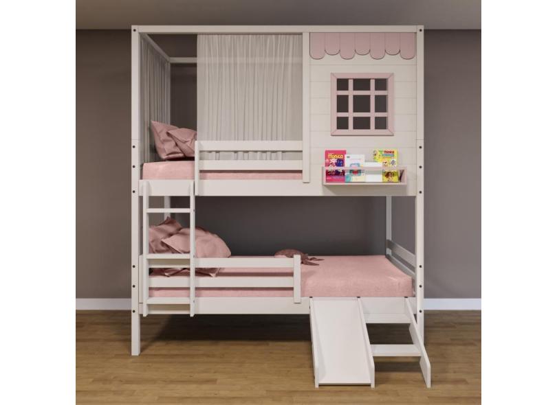 Beliche Casinha Reta com Grade Removível Escorregador e Cortina Madeira Maciça Branco/ Rosa Housin