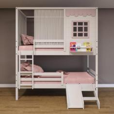 O menor preço encontrado no Brasil para Beliche Casinha Reta com Grade Removível Escorregador e Cortina Madeira Maciça Branco/ Rosa Housin atualmente é R$ 2.702,35.