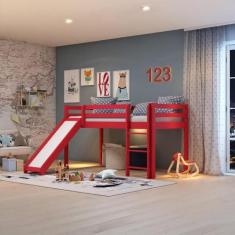 Cama Alta Kids com Escorregador em Madeira Maciça - Vermelho