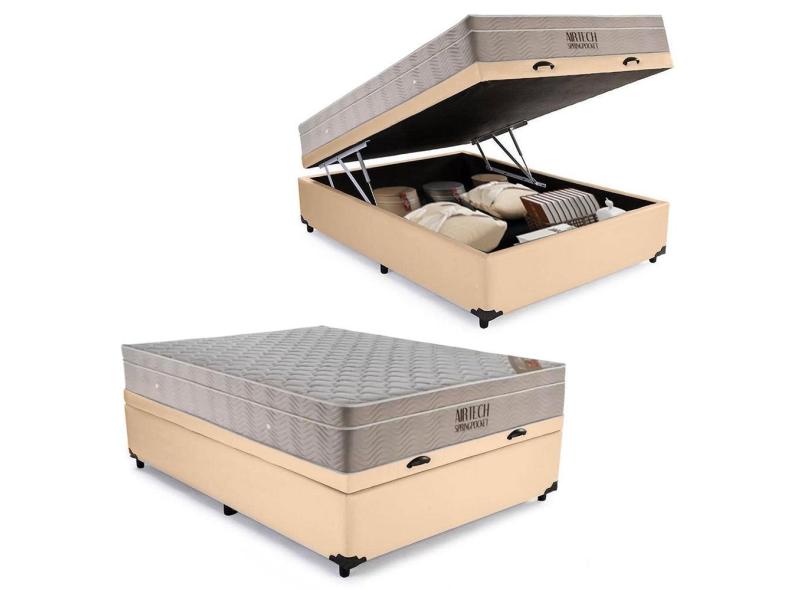 Cama Baú Casal Sintético + Colchão Ortobom Airtech Molas Ensacadas 65x138x188 Bege