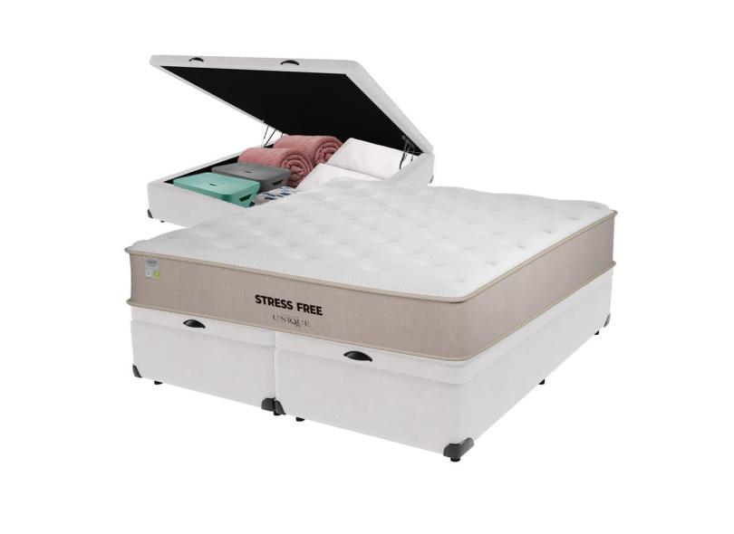 Cama Box Baú Branco e Colchão Queen StressFree Espuma D28 Unique
