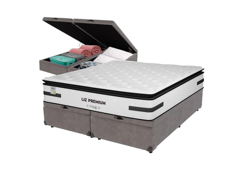 Cama Box Baú Cinza e Colchão King Liz Premium Molas Ensacadas Unique