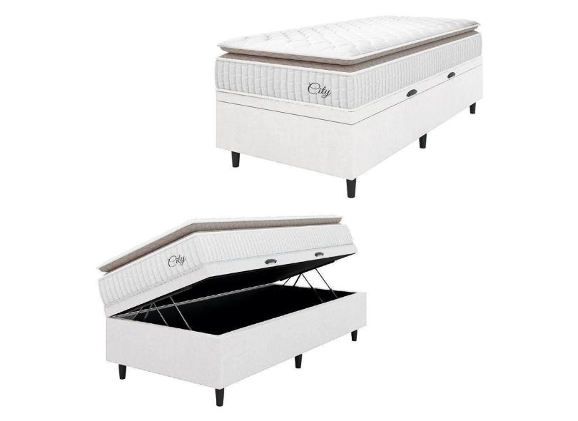 Cama Box Baú Colchão Solteiro Molas Ensacadas City Pillow Top 88x188x64cm Linho Branco / Bege Hellen Branco
