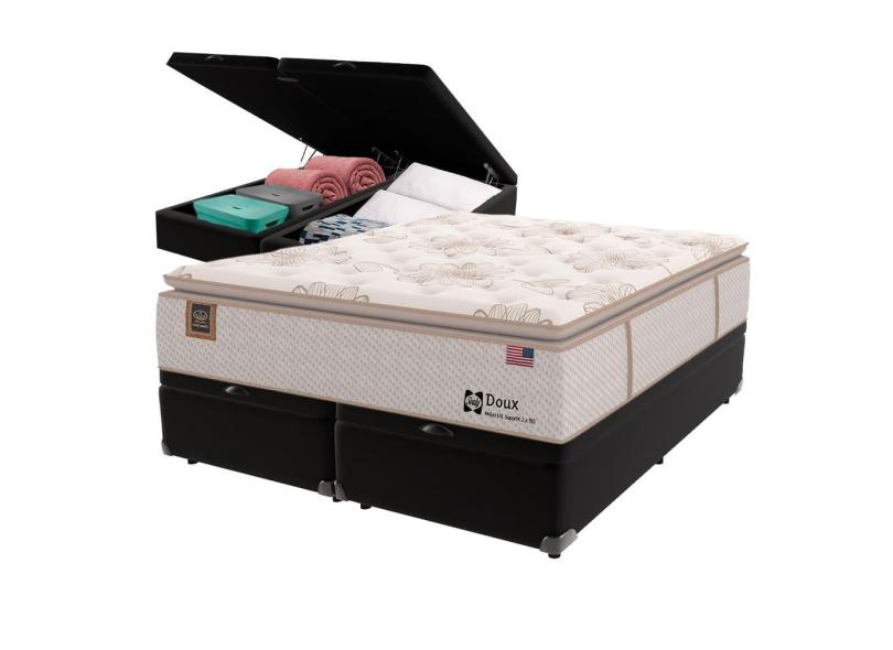 Cama Box Baú Preto e Colchão King Doux Comfort Molas LFK e Europillow Sealy