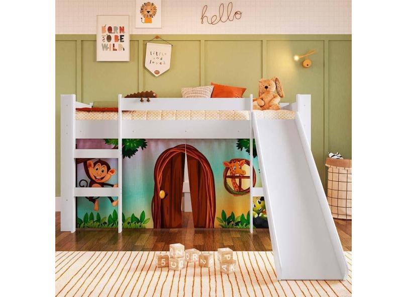 Cama Cabaninha Infantil Montessori Com Escorrega Branco E Cortina Estampada Zoo Cirion Jm Móveis