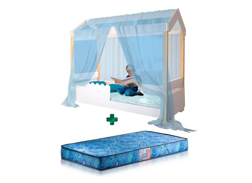 Cama Casinha Com Voal Azul Solteiro Branco Jhulia Divaloto Com Colchão Gazin