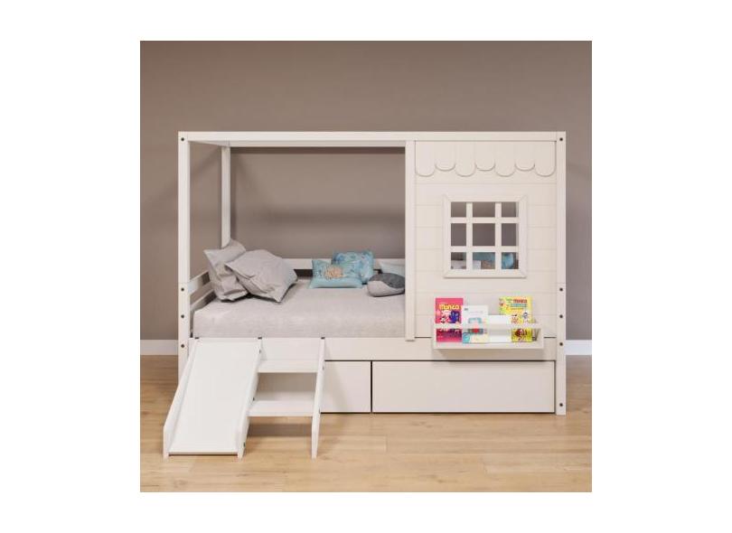 Cama Casinha Reta Com 02 Gavetas E Escorregador Madeira Maciça Branco