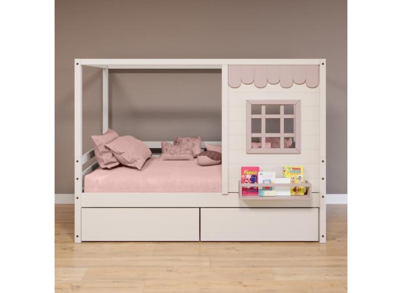 Cama Casinha Reta com 02 Gavetas Madeira Maciça Branco/ Rosa Housin