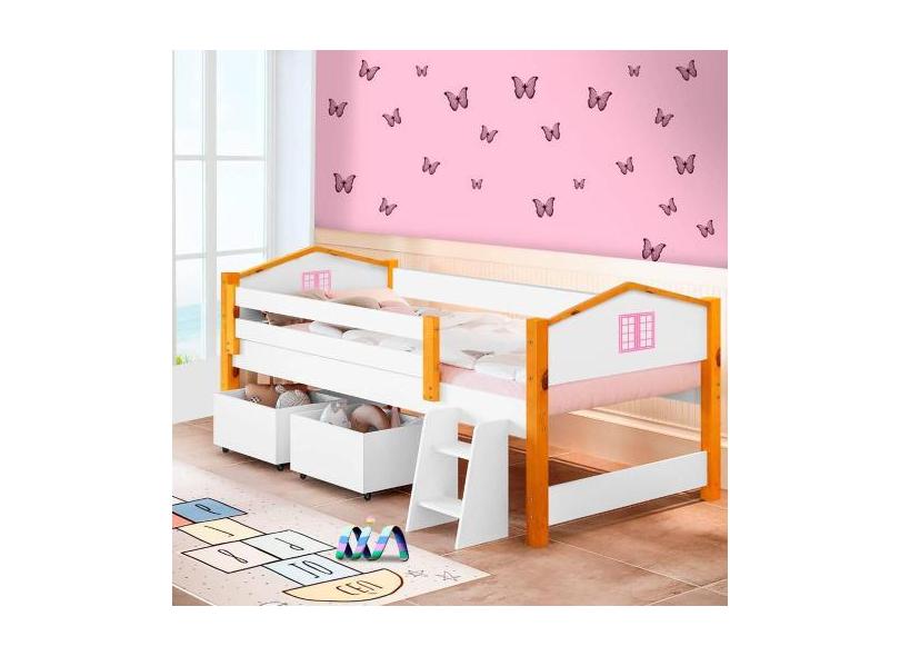 Cama Com Grade De Proteção Solteiro Casinha Com Baús Branco Rosa Elza