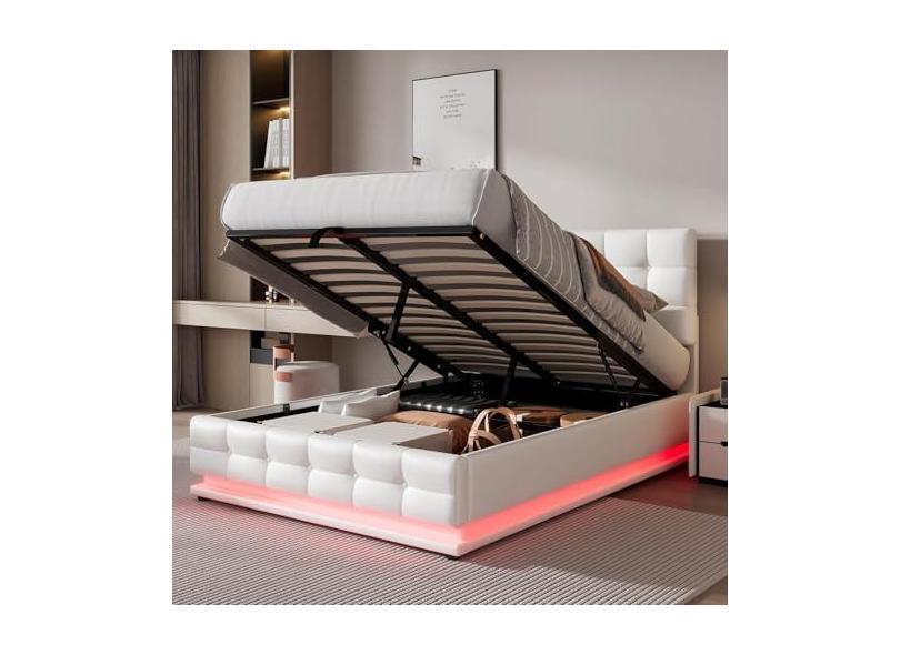 Cama de armazenamento com elevador otomano com iluminação LED, estrutura de cama de casal de 4 pés6, estrutura de cama estofada em couro sintético PU com elevador a gás grande armazenamento,