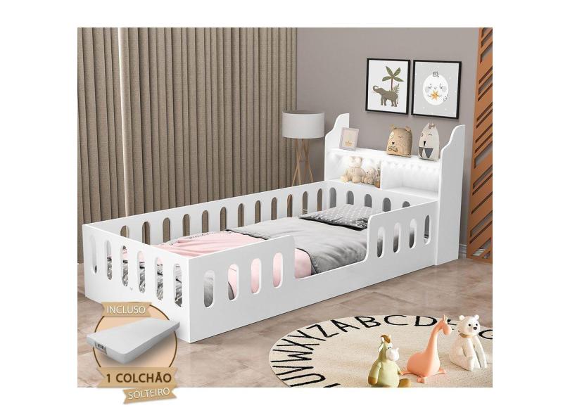 Cama De Criança Helo Solteiro Com Colchão + Nicho E Led Branca - Cor: Branco