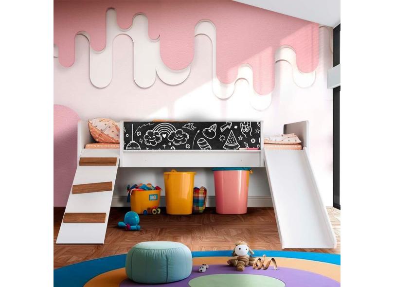 Cama infantil com escorregador e lousa branca