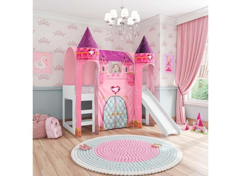 Cama Infantil Joy com Escorregador Dossel Barraca Castelo e 02 Torres Branco Rosa Pura Magia