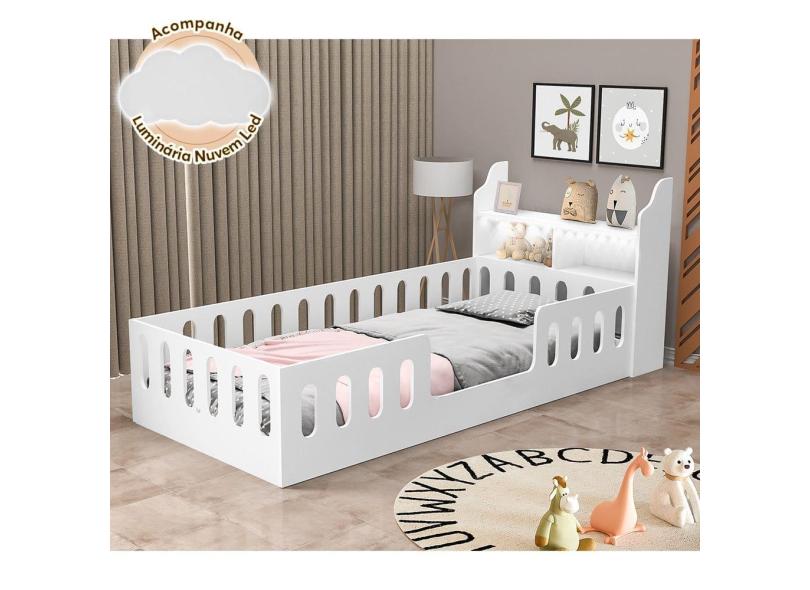 Cama Infantil Montessoriana Helo Solteiro com Nicho e Led Branca Acompanha Luminária Nuvem