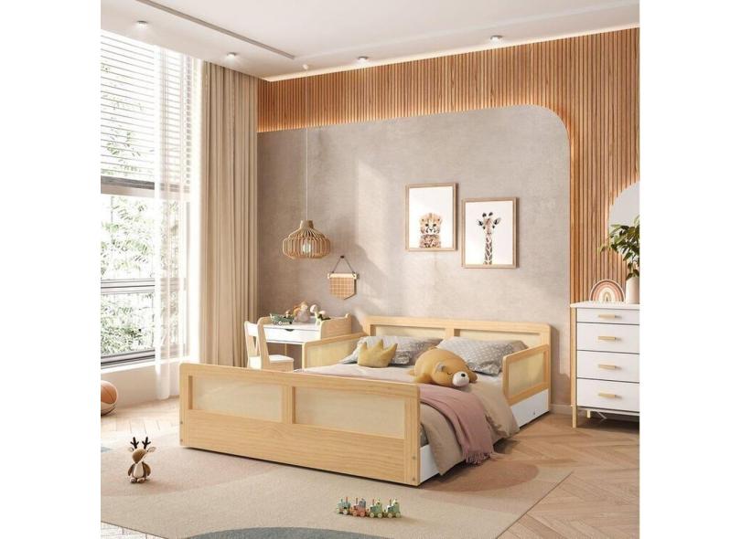 Cama Montessoriano Casal Lift em Madeira Maciça com Rattan 2 Grades Casatema Branco/Natural