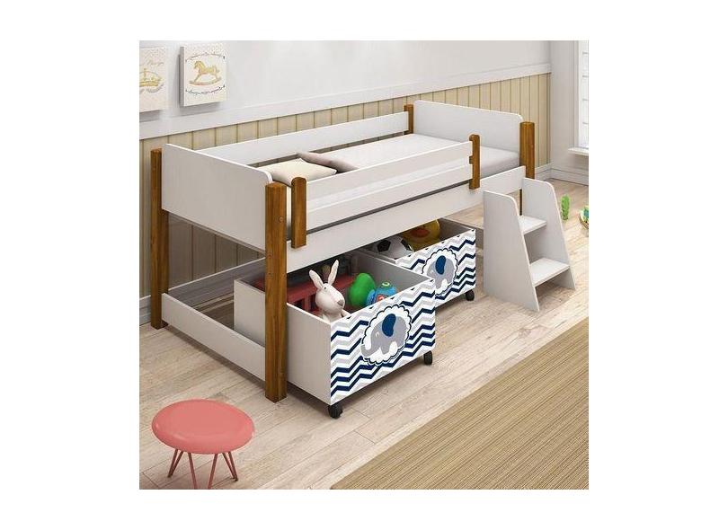 Cama Naty Branco/Mel Com 2 Nichos Adesivadas Azul E Escadinha - Dival