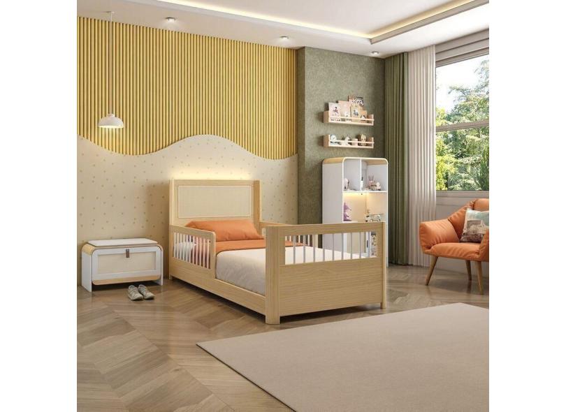 Cama Solteiro Montessoriana Reversível,Estante 4 Nichos e LED, Sapateira 1 PT Infantil Wave Casatema Branco/Natural