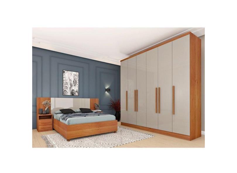 Quarto Casal Completo Roupeiro Veneza 4 Gavetas, Cama Casal Mônaco e Painel Ripado 4 Gavetas Cinamomo/Off White