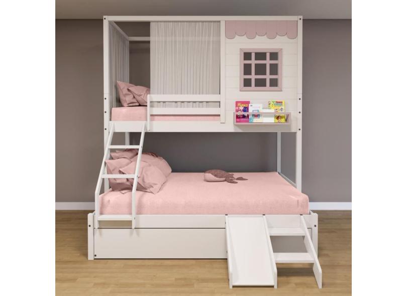 Treliche Casinha Reta Casal- Solteiro Com Escorregador E Cortina Madeira Maciça Branco- Rosa Housin