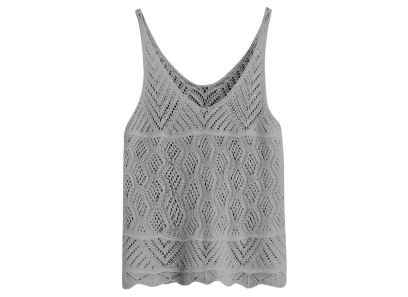 Blusa feminina sem mangas com decote em V de crochê de malha regata solta e oca