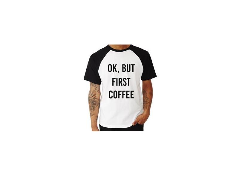 Camiseta Raglan OK, but first coffee - Foca na Moda